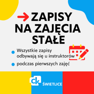 Zapisy na zajęcia stałe odbywają się bezpośrednio przed pierwszymi zajęciami u instruktora. Warunkiem udziału jest wcześniejsze wypełnienie deklaracji uczestnictwa.